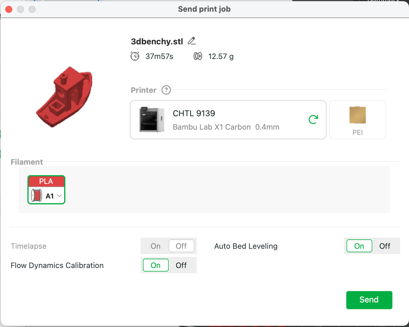 Finally, click “Send” and watch it go! The printer will take 5-7 minutes to heat up and perform some initial checks, but be patient, because these checks are important to ensure the job will succeed! You can monitor the process in Bambu Studio or by looking at the screen on the printer.