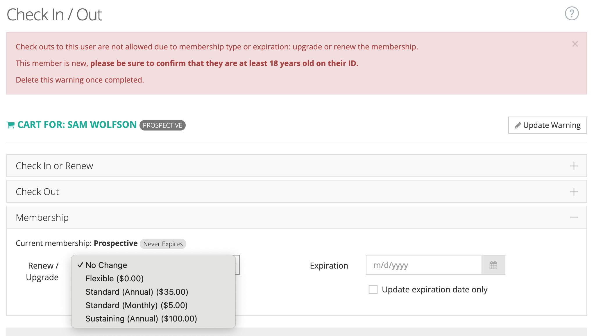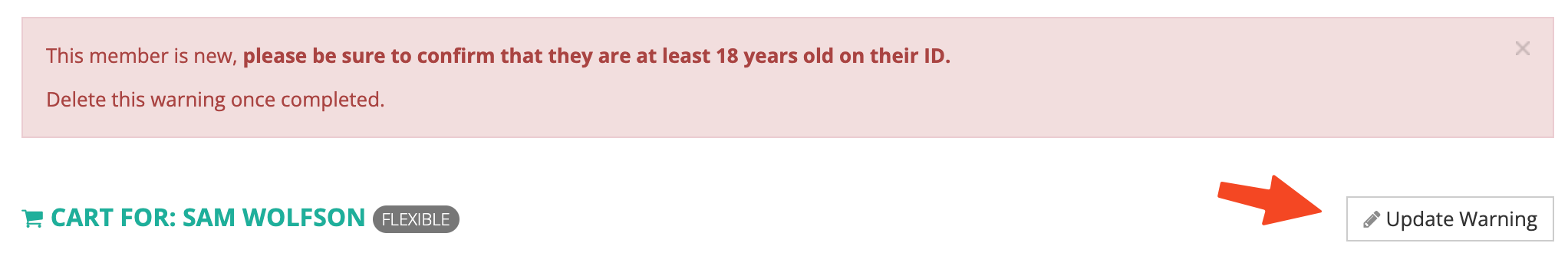Section titled “All New Users {#all-new-users}”If the member signed up for MyTurn and already created a membership (or if you just created one above), you must check their ID to ensure they are at least 18 years old. Once you have verified this, click “Update Warning” and delete the warning text: